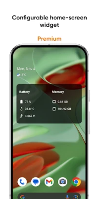 • Configurable home-screen widget, with information about battery, memory, and more;
